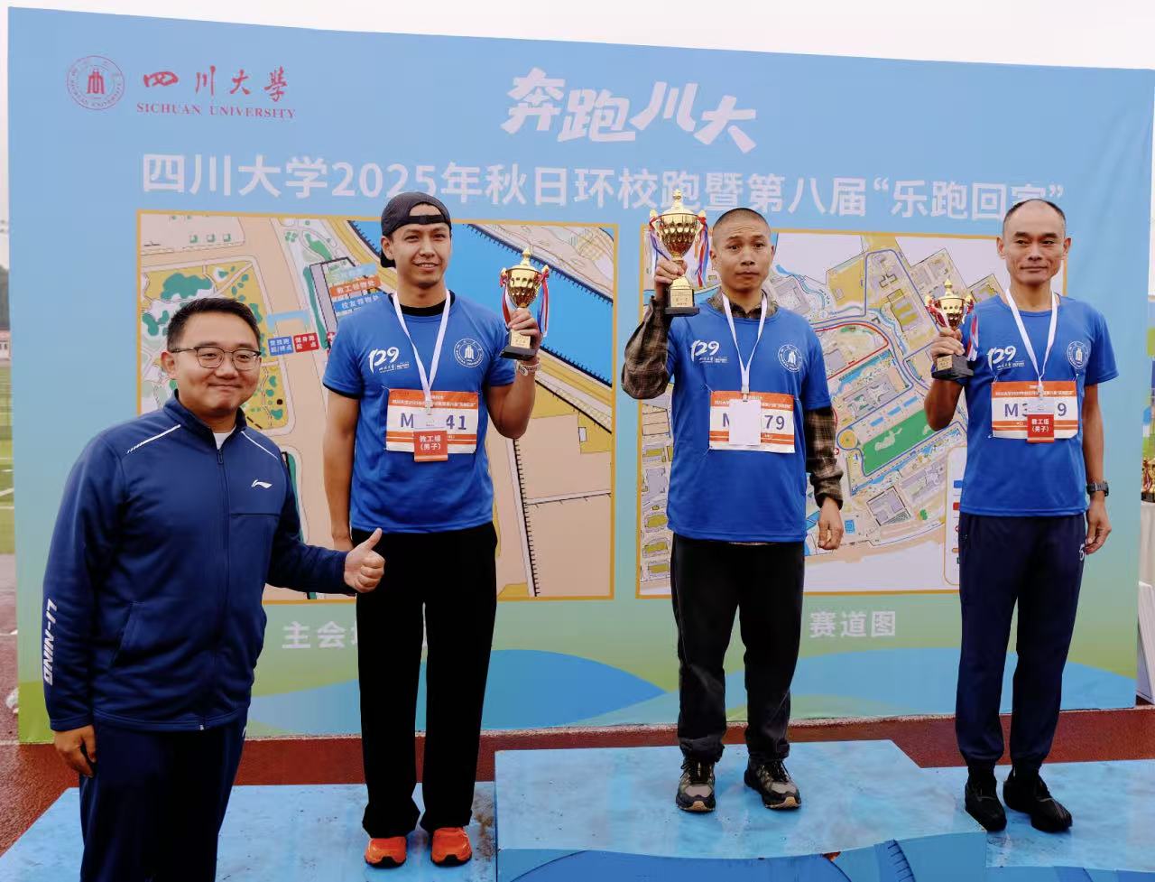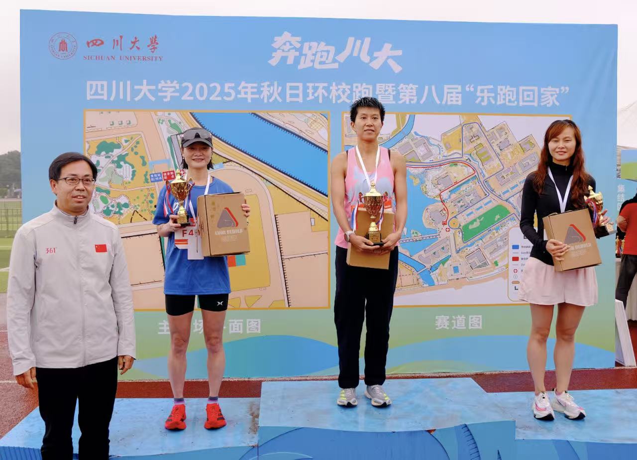 第八届“乐跑回家”教工组男女第一名分别由华西临床医学院(华西医院)彭佳、华西公共卫生学院(华西第四医院)张巾娜获得,学校相关部门负责人为获奖选手颁奖。